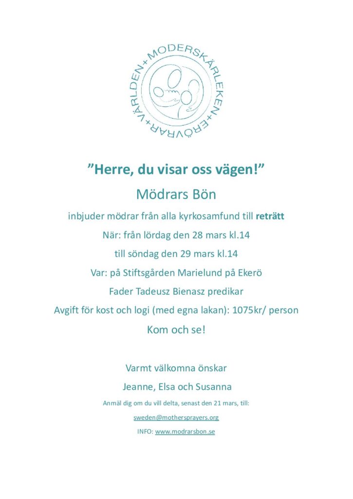 Mödrars bön erbjöd lördag 15 – söndag 16 mars en reträtt på Marielund. Mödrarna fick mitt under fastan möjlighet att ta en paus, tillbringa tid med Herren samt träffa andra mödrar och dela erfarenheter.